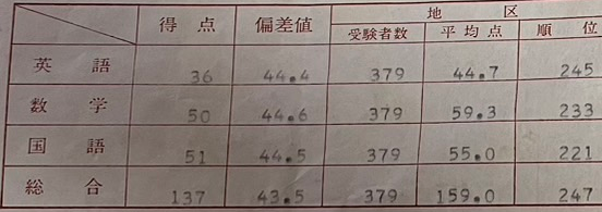 中学2年の時の試験結果。偏差43.5に我ながらびっくり。そりゃ公立高校落ちるわけだ。(落ちたのは同学年で10人もいなかったはず)