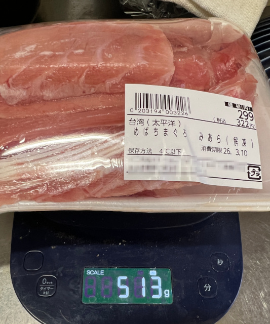 んで晩ご飯用に、ちょっと大きめの部分をオリーブオイルでマリネにしてるところ。ついでに冷凍庫にあったビンチョウマグロも。