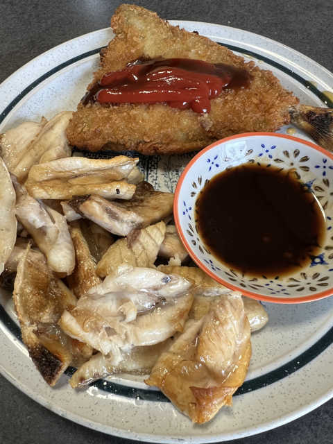 ヒラマサのあらとアジフライっす。ヒラマサのあらは骨注意。